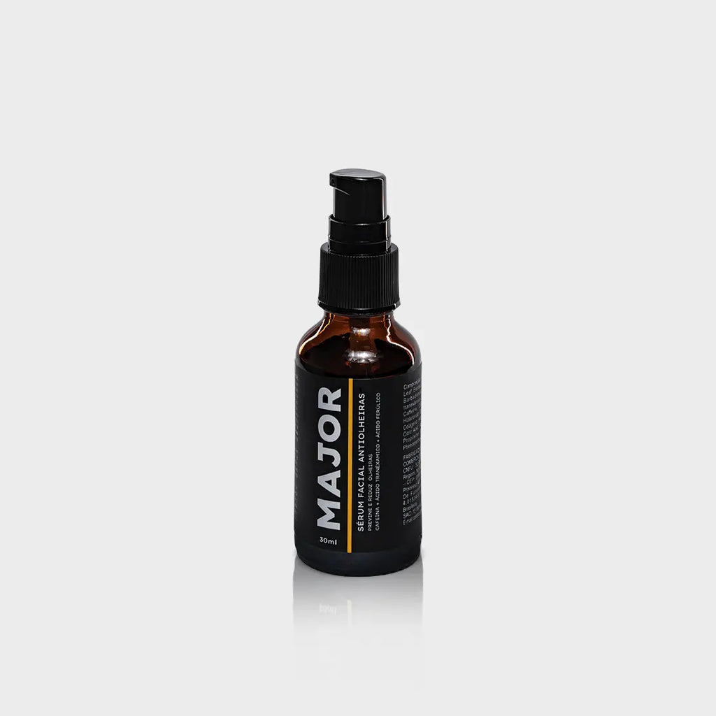 O Sérum MAJOR foi desenvolvido para homens que buscam um olhar mais descansado e revitalizado. Sua fórmula combina Cafeína, Ácido Tranexâmico e Ácido Ferúlico, ativos que atuam diretamente na diminuição de olheiras, inchaços e bolsas, estimulando a circulação e uniformizando o tom da pele.